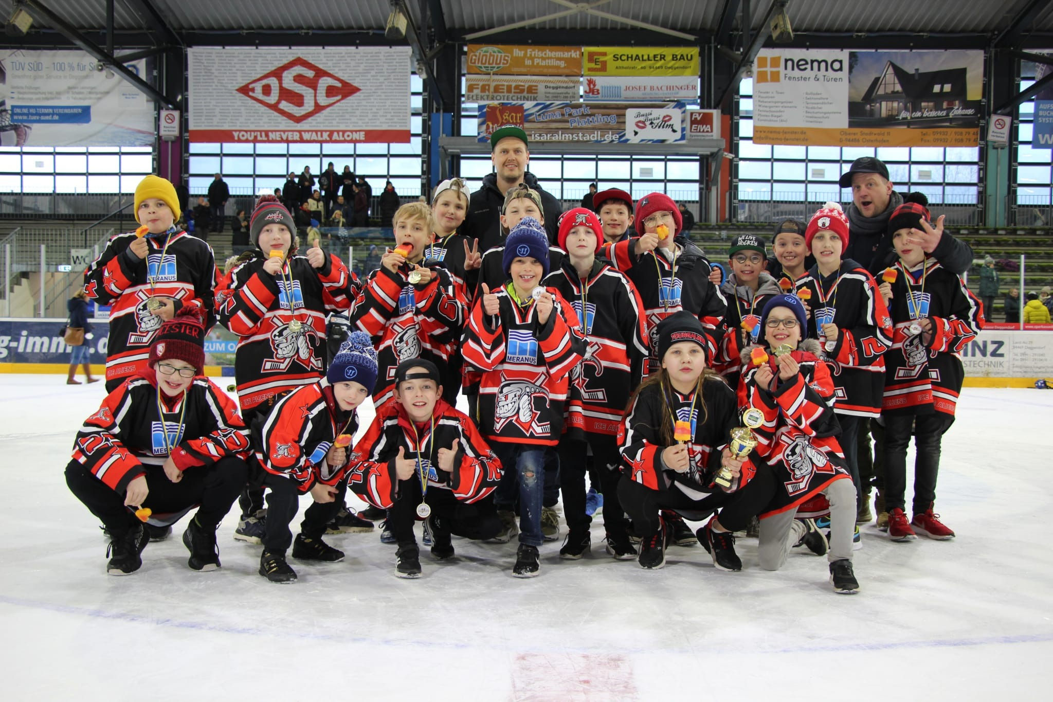 Die Kleinschüler der Ice Aliens nahmen auf Einladung des Deggendorfer EC zum Abschluss der Saison am YORMA’s U11 Eishockey Cup 2022 in Deggendorf teil. Trotz vieler Absagen von Spielern beendete das Team unter Interimscoach Sebastian das Turnier mit dem vierten Platz und kehrt müde aber glücklich und zufrieden zurück ins Rheinland.